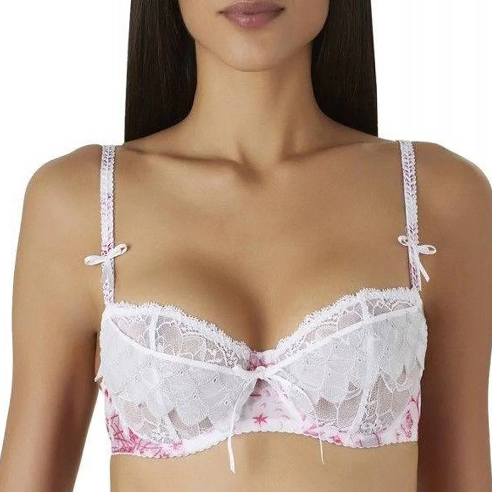 Бюстгальтер Soleil Levant від французького бренду Aubade Виконаний з тонкої еластичної тканини з ніжним принтом і делікатного мереживного тюлю. М’яка чашка на кісточці прикрашена тюлем із принтом та атласним бантиком. Регульовані бретелі оформлені мереживною тасьмою та кокетливими атдасними бантиками. Застібка на 2 гачки в 3 позиції об’єму.