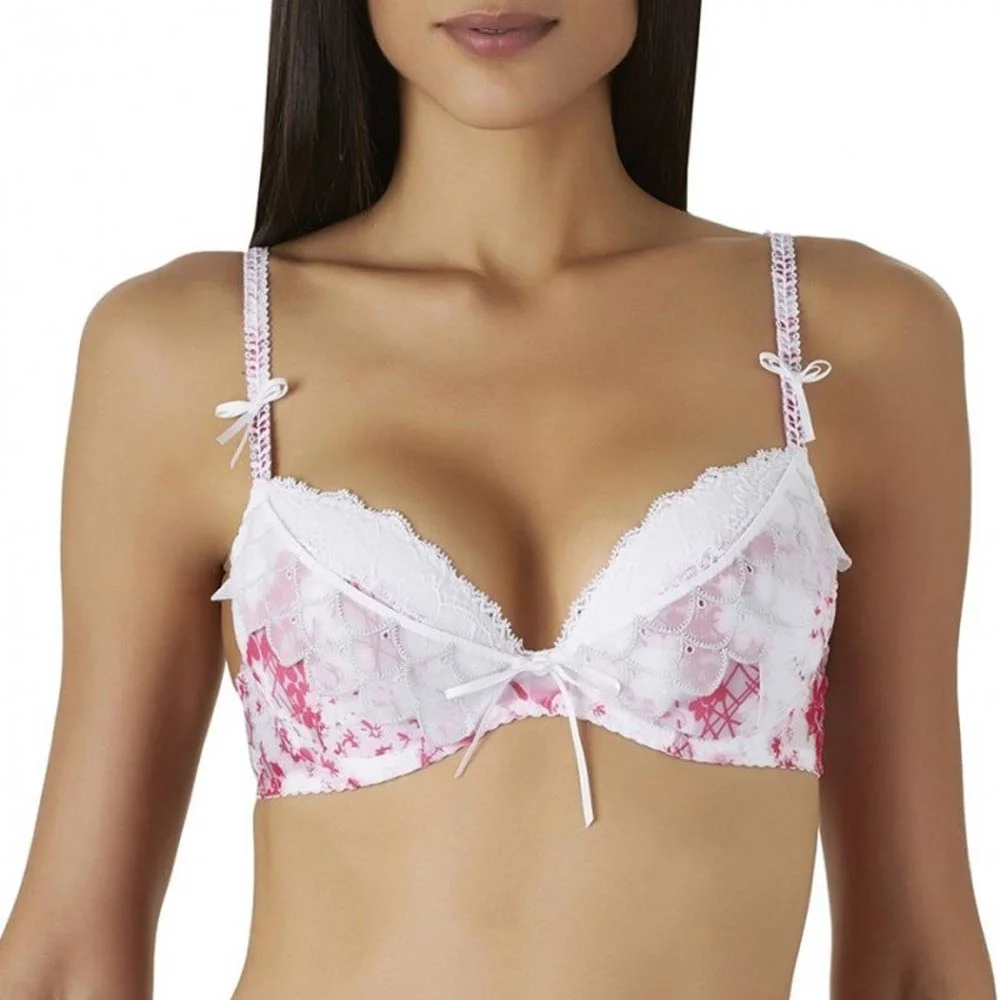 Французький бюстгальтер Soleil Levant від Aubade. Модель на кісточках з ущільненої чашкою пуш ап. Виконаний з тонкої еластичної тканини з ніжним принтом і делікатного мереживного тюлю. Центр чашок прикрашений тюлем у вигляді пелюсток, укладені шарами. Регульовані бретелі оформлені мереживною тасьмою та кокетливими атласними бантиками. Застібка на 2 гачки в 3 позиції об’єму.