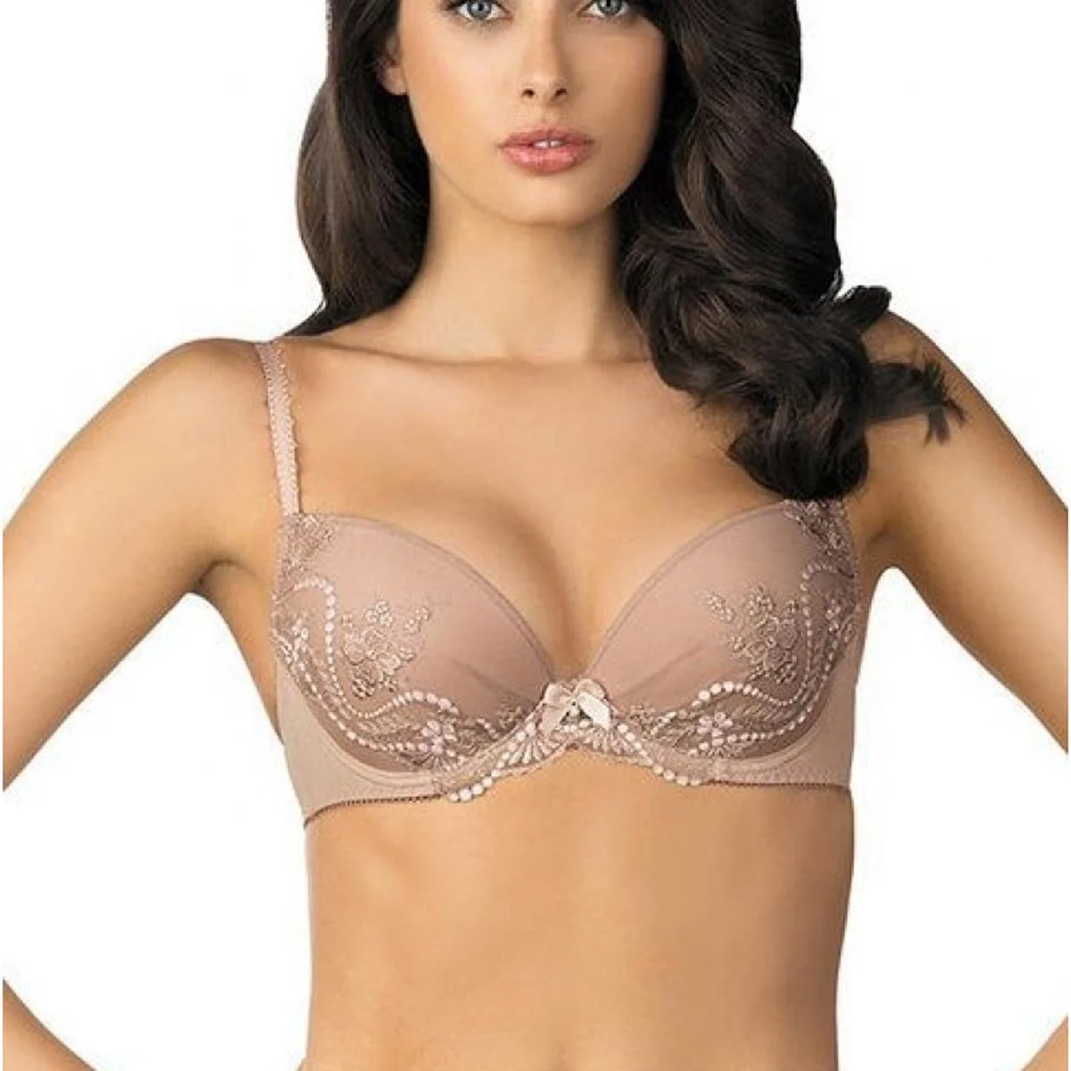 Бюстгальтер від французького бренду Marc & Andre на каркасній підтримці з формованою чашкою та вбудованим пуш-ап. Бічні деталі посилені вертикальними кісточками, які забезпечують додаткову підтримку грудей. Бретели з регулятором довжини, незнімні. Спинка із застібкою на два гачки. Бюстгальтер виконаний у бежевому кольорі з витонченою вишивкою. Декор – сатиновий бантик із кристалом. Білизна відрізняється дивовижною універсальністю, вона комфортна і практична, підходить під одяг будь-якого кольору.