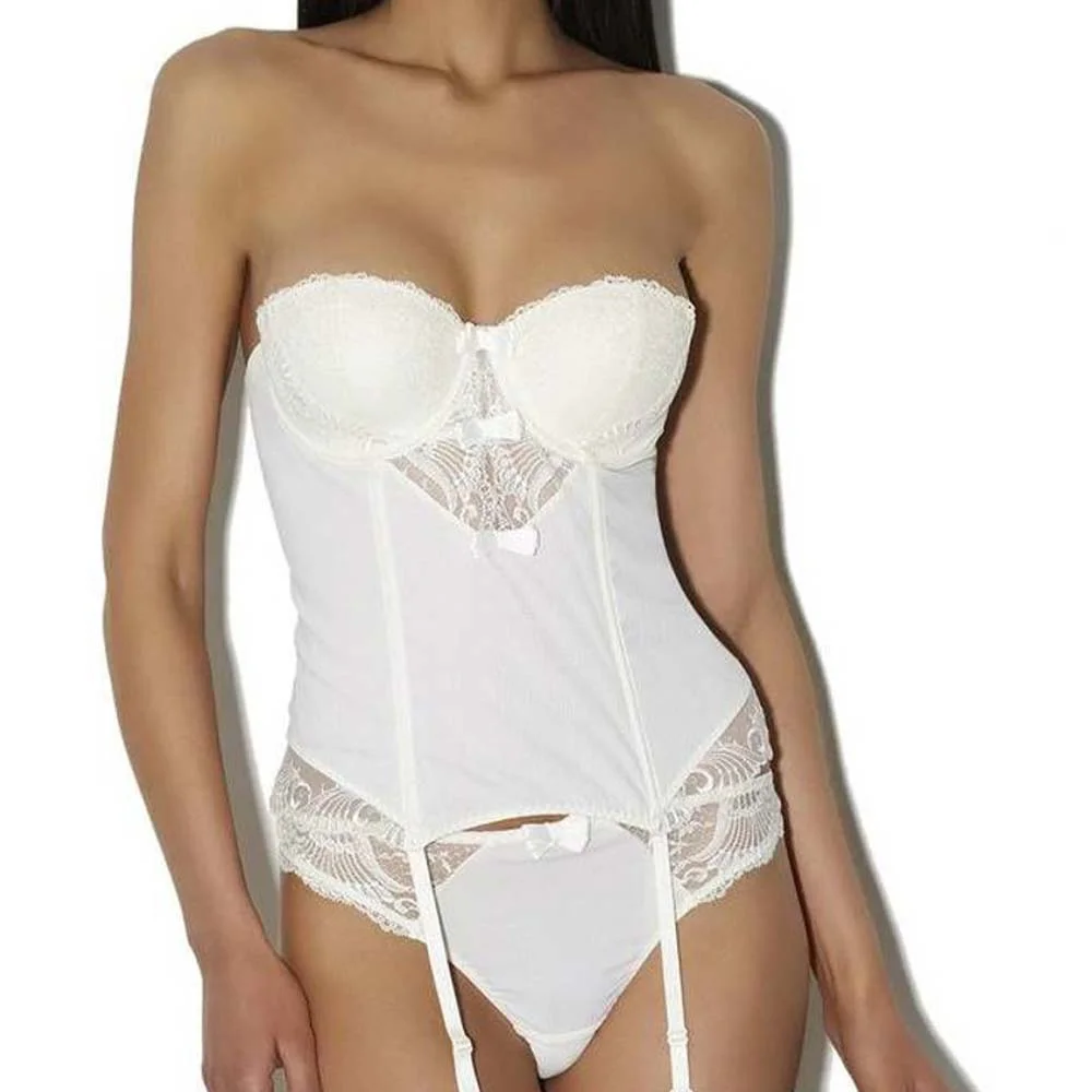 Корсет лінії спідньої білизни L’Insoumise від французького бренду Aubade. Корсет із ущільненими чашками на кісточках. Виконаний у поєднанні тюлю та перлинного мережива, які чудово підкреслюють усі форми. Шарм полягає в безлічі спокусливих деталей, таких як мереживо Leavers (відоме своєю надзвичайною витонченістю та різноманітністю квіткових візерунків), швейцарського тюлю та декоративних елементів у вигляді бантів. Регульовані бретелі, що знімаються. Корпус з вертикальними гнучкими пластинами для опімальної фіксації. Спинка із застібками на гачки. Підв’язки для панчіх із регулятором довжини. Ідеально підходить для весілля.