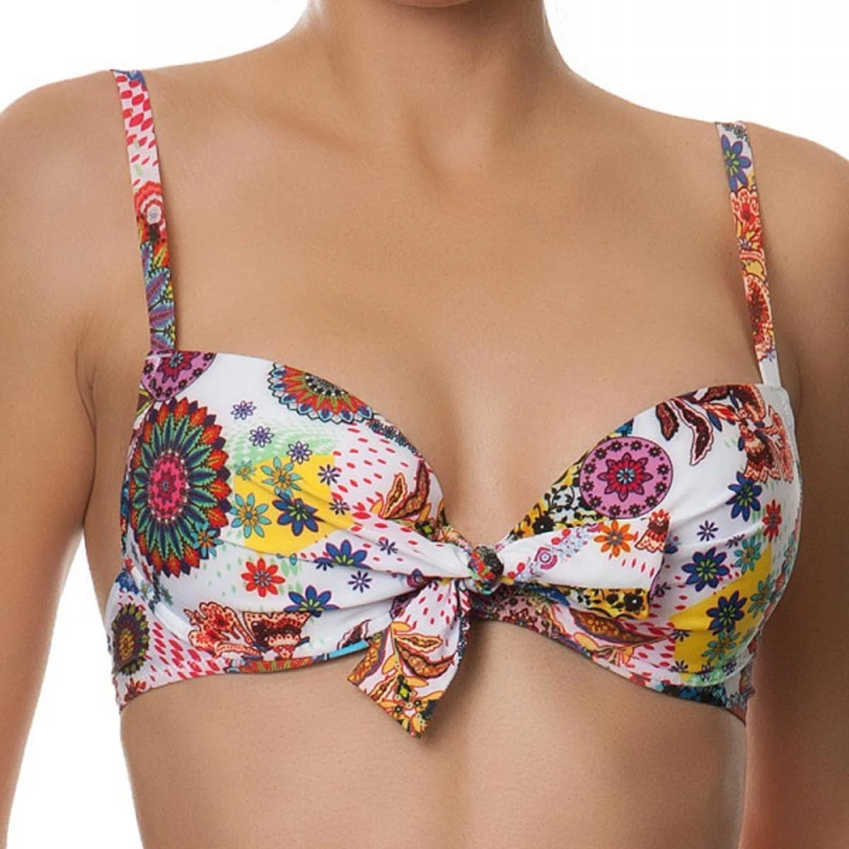 Купальний бюст колекції LA SAMARKAND від французького бренду Antigel de Lise Charmel. Бюстгальтер на кісточках із формованими чашками. Між чашок фіксуючий бант, який утворює ефектне драпірування. Знімні бретели на спині, перестібаються хрест на хрест. Класична застібка на спині. Бюстгальтер виконаний з гладкої еластичної мікрофібри з принтом колористичної пишноти з індо-перськими декоративними мотивами у вигляді стилізованих медальйонів.