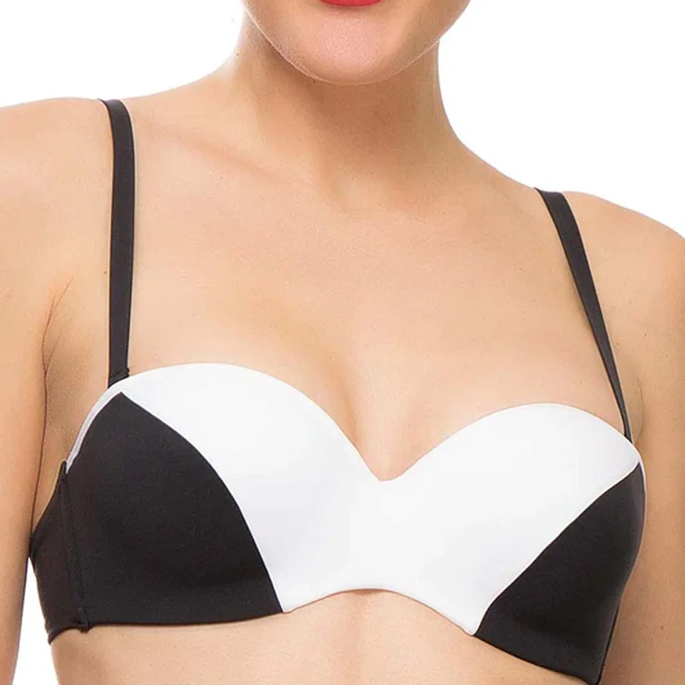 Купальний ліф пляжної лінії Audace Beauté від французького бренду Lise Charmel. Лінія в круїзному стилі, натхненна грацією краси Стародавньої Греції, що поєднує в собі елегантність і сучасність і відображає суть тренду. Топ бандо на кісточках із ущільненими чашками гарно піднімає груди, забезпечує ідеальну посадку та чуттєво оголює верхню частину бюста. Посилені бічні деталі для оптимальної підтримки та фіксації. Підходить для будь-якої форми грудей! Багатопозиційні знімні бретелі можна фіксувати різними способами. Чашки виготовлені із еластичної лайкри. Декоративний знімний аксесуар з металевим кільцем надає цій моделі елегантності. Застібка на спинці із логотипом бренду Lise Charmel. Виконаний у простому стриманому стилі та комбінації чорного з білим, купальник Audace Beauté підкуповує шляхетною простотою, вишуканістю та витонченістю.