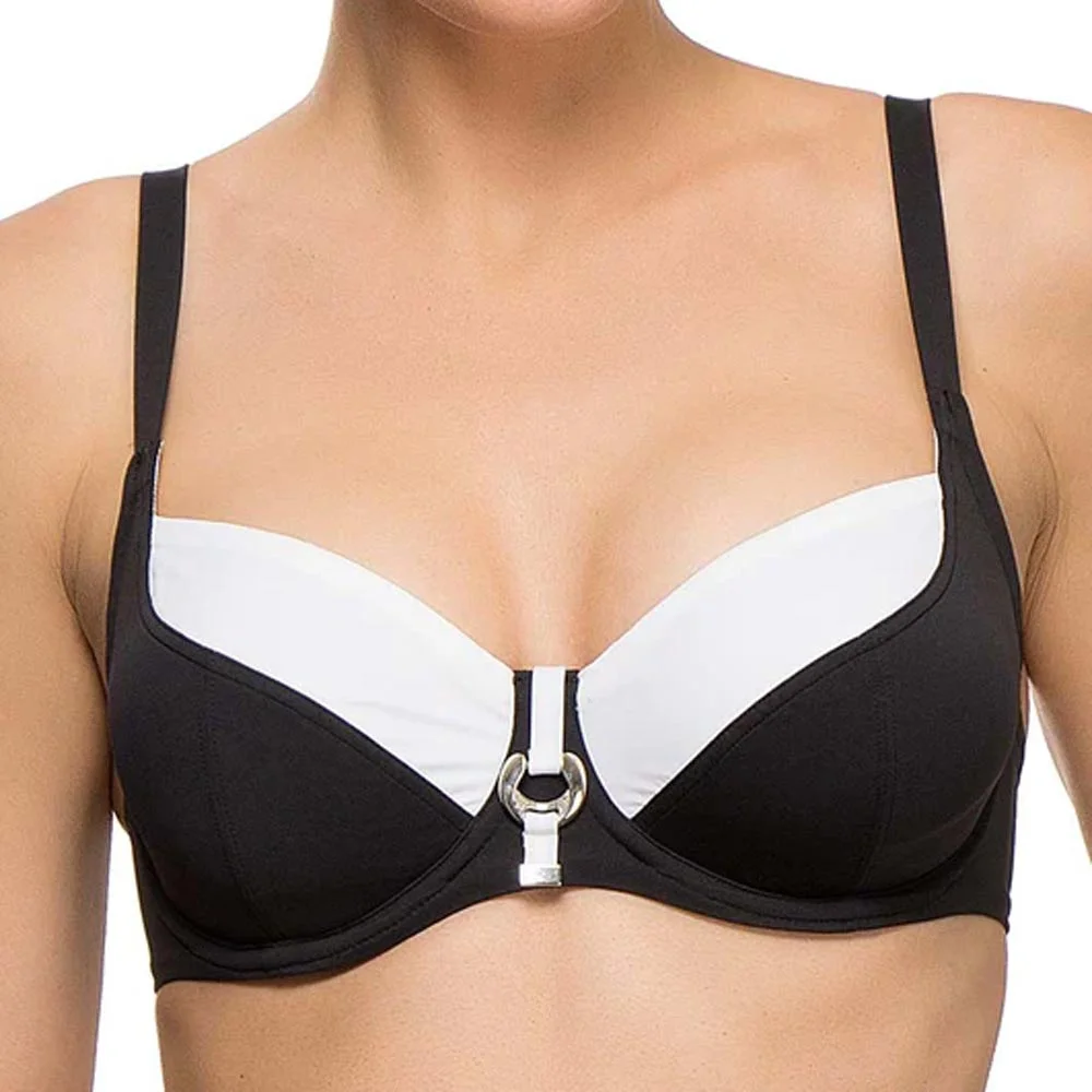 Купальний бюстгальтер пляжної лінії Audace Beauté від французького бренду Lise Charmel. Красивий, елегантний бюстгальтер-мінімайзер на кісточках з вертикальними та діагональними швами збирає, піднімає та округляє груди. Ідеально підходить для великих грудей! Досить висока перемичка між чашками. Багатопозиційні комфортні бретелі відстібаються на спинці. Чашки виконані з еластичної лайкри на підкладці з тюлю для міцності. Декоративні металеві елементи надають цій моделі елегантності. Застібка на спинці із логотипом бренду Lise Charmel.