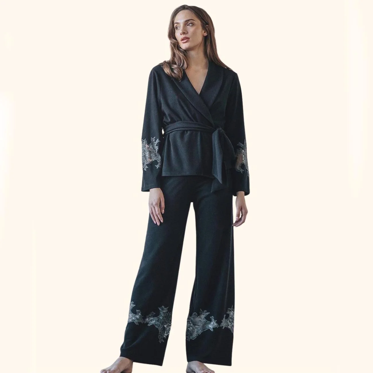 Жіночий домашній костюм із двох предметів від українського бренду Felena колекція Black Tulip виконаний із сумішевого полотна із вмістом 38% вовни та 26% кашеміру. Кардиган на запах з поясом, який надійно фіксується шльовками на талії. Довгі рукави оформлені фігурними вставками із ажурного мережива. Комір шалька гармонійно вписується в стилістику комплекту. Штани вільного крою, розкльошені донизу, не сковують рухів. Еластичний пояс на резинці. Комфортний елегантний костюм, теплий, універсальний підійде для щоденного використання в період холодів.