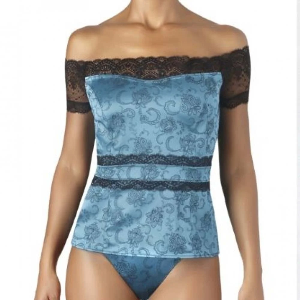 Топ-блузка Delice колекції Delice D Inities від французького бренду Aubade. Топ прилеглого силуету виконаний у поєднанні еластичного італійського синього атласу з набивним квітковим орнаментом та чорного мережива. Відкриті плечі. Мереживне декольте з демі-рукави. По талії мереживні смуги. Блискавка на спині.