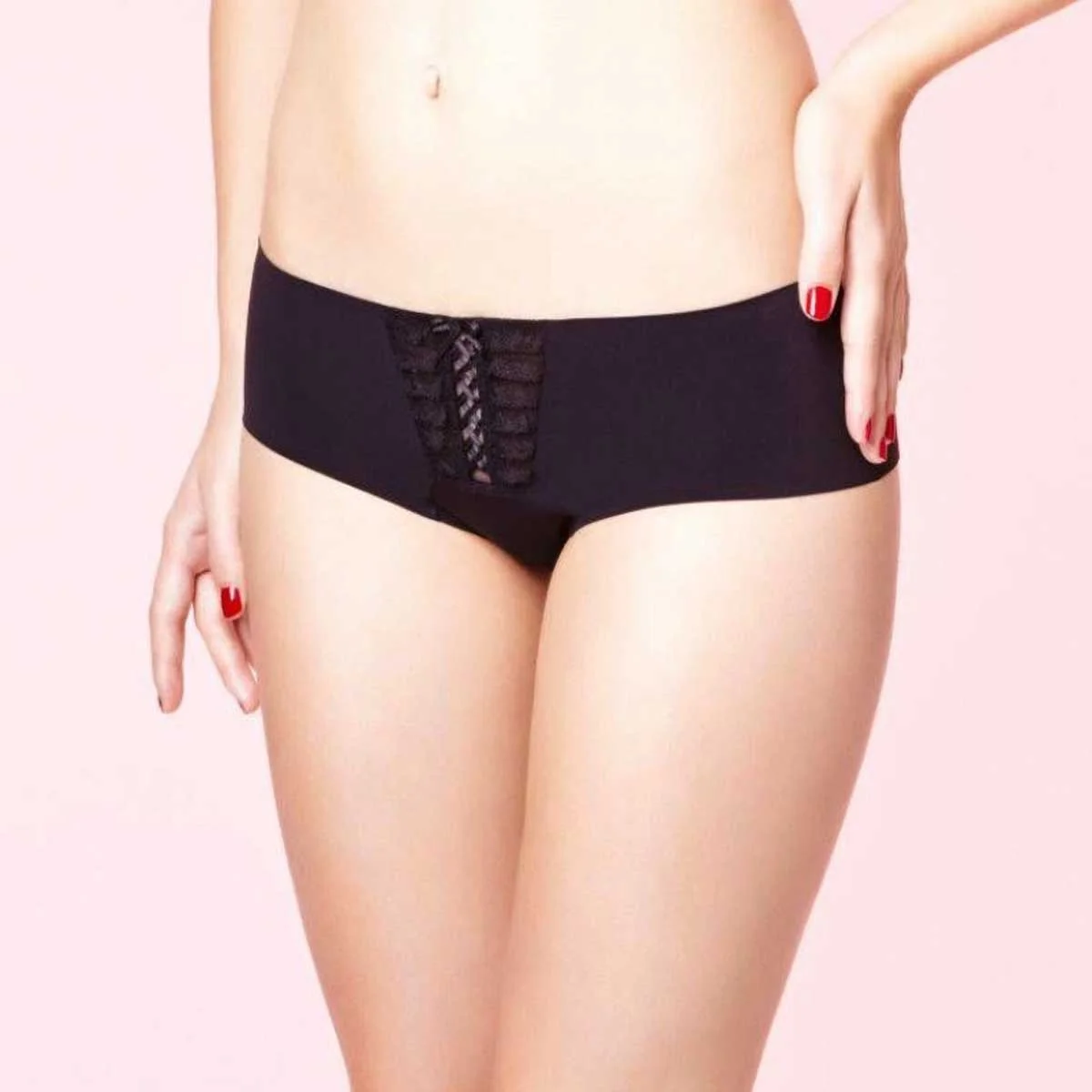 Жіночі шорти Badinage від бренду Chantal Thomass заниженою посадки. Центр передньої панелі декорований мереживними рюшами та шнурівкою із сатиновими стрічками. Задня деталь із центральним призбираним швом, що забезпечує оптимальне облягання. Краї, виконані за технологією спаювання тканини, не виділяються під одягом. Бавовняна ластоаиця.