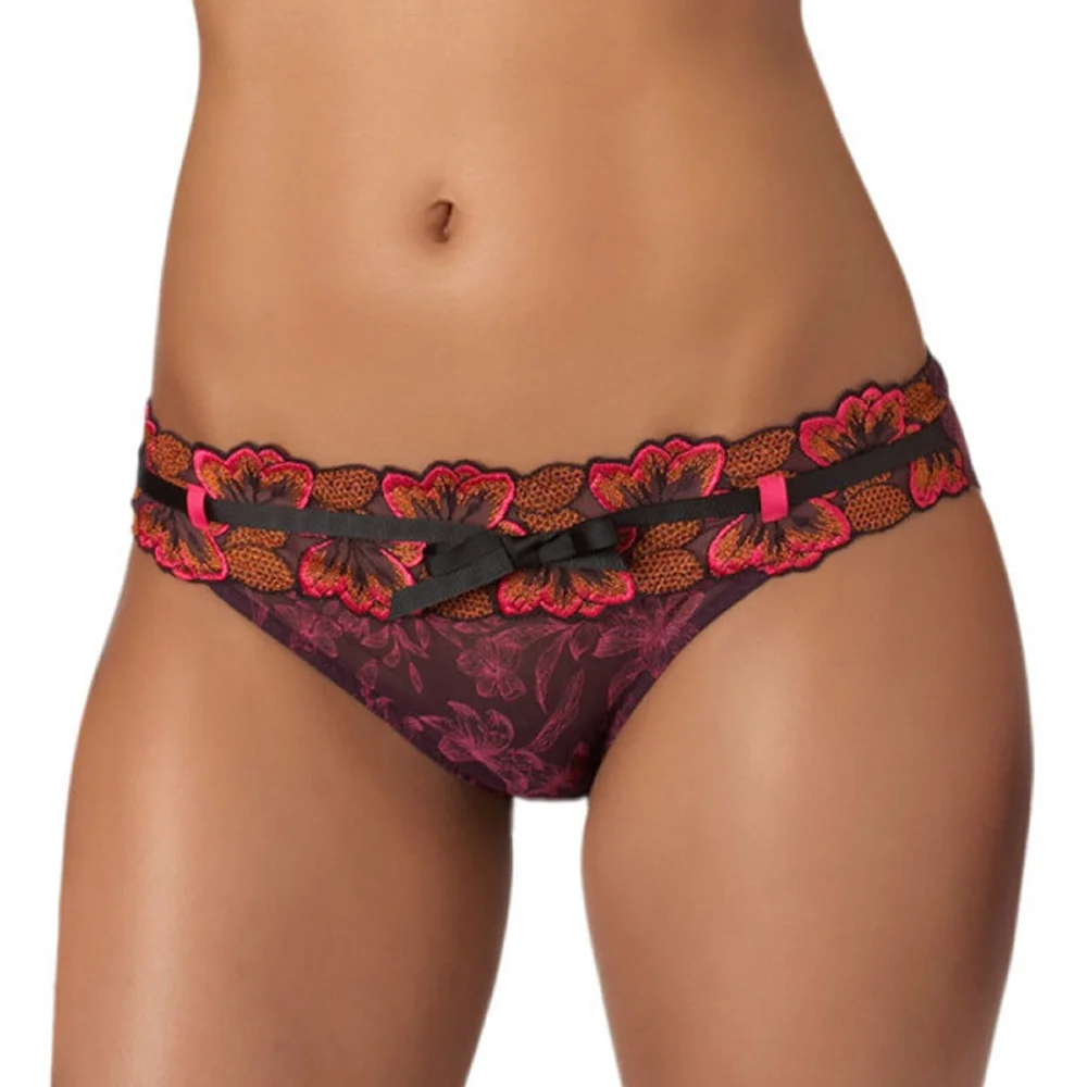 Сексуальні трусики-стринг Aubade лінія Polynesienne. Стринги виконані з еластичного тюля з квітковим принтом. Передня деталь по лінії пояса оформлена вишуканою вишивкою. Декор- тоненька тасьма з фіксацією бантом. Сідниці відкриті. Бавовняна ластовиця.