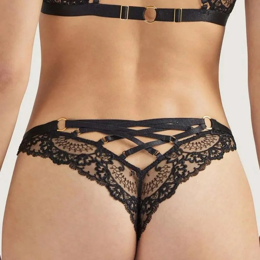 Французький бренд Aubade – колекція La Rein de la Nuit. Гламурні спокусливі трусики стрінги заниженої посадки виконані з прозорого зухвалого мережива у глибокому і чарівному чорному кольорі. Ресикові фестони підкреслюють сідниці. Трикутний виріз задньої деталі оформлений сплетенням тонких стрічок із золотистою фурнітурою. Бавовняна ластовиця.