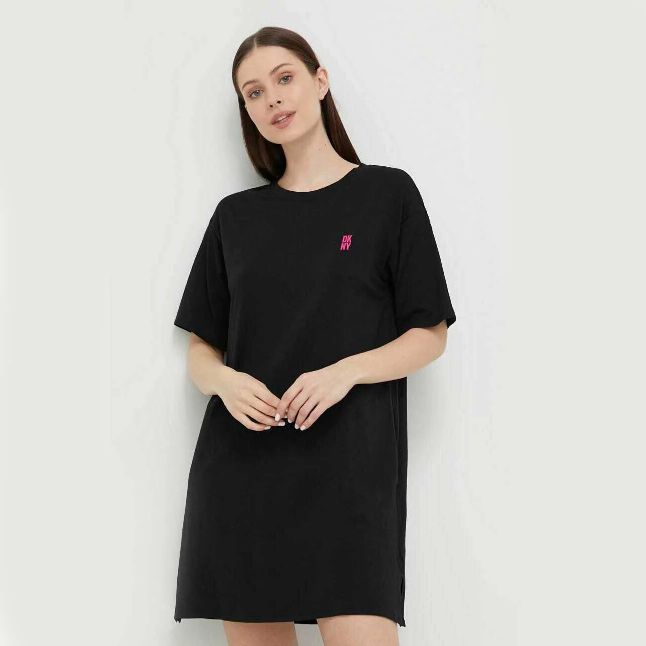 Домашнє туніка від бренду Donna Karan (DKNY). Модель прямого класичного крою з округлим вирізом горловини. Короткий рукав із заниженою лінією плечей. Бічні шви оформлені невеликими розрізами та врізними кишенями. Виконана з еластичного трикотажу у чорному кольорі з принтом бренду DKNY. Комфортна модель подарує вам неперевершене відчуття легкості та комфорту.