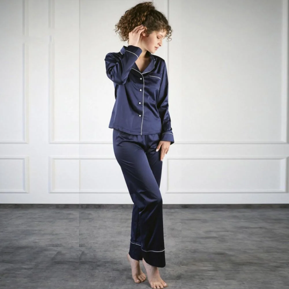 Класична шовкова піжама із двох предметів від українського бренду Felena. Піжама виконана з ніжного високоякісного натурального шовку 94% з домішкою 6% еластану. Жакет вільного крою із застібкою на гудзики. Довгі рукави із манжетами. Відкладний комір і лацкани із закругленими краями. Ліва поличка оформлена накладною кишенею. Прямі класичні штани на еластичному поясі з м’якою гумкою та декоративними манжетами. Комплект представлений у кольорі античної троянди та у синьому кольорі. Декор – тонкий кант контрастного кольору. Комфортний стильний комплект, який можна використовувати для сну та домашнього відпочинку.