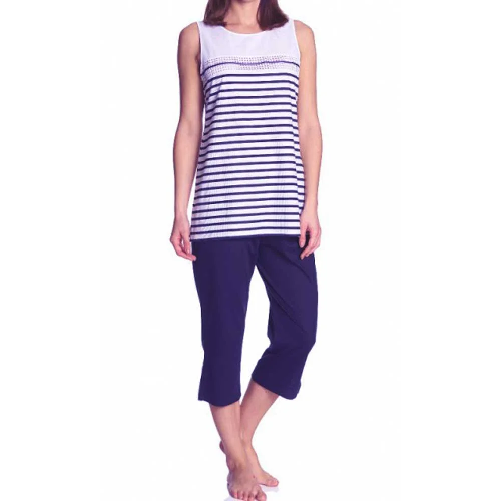 Літній комплект для жінок від німецького бренду Feraud. Стильна футболка-безрукавка зі 100% бавовняного полотна з модним принтом в морському стилі. Футболка прямого крою з округлим вирізом горловини. Однотонні бриджі синього кольору на еластичному поясі. Дизайн комплекту дозволяє його використання як піжами для сну, так і для комфортного домашнього відпочинку.